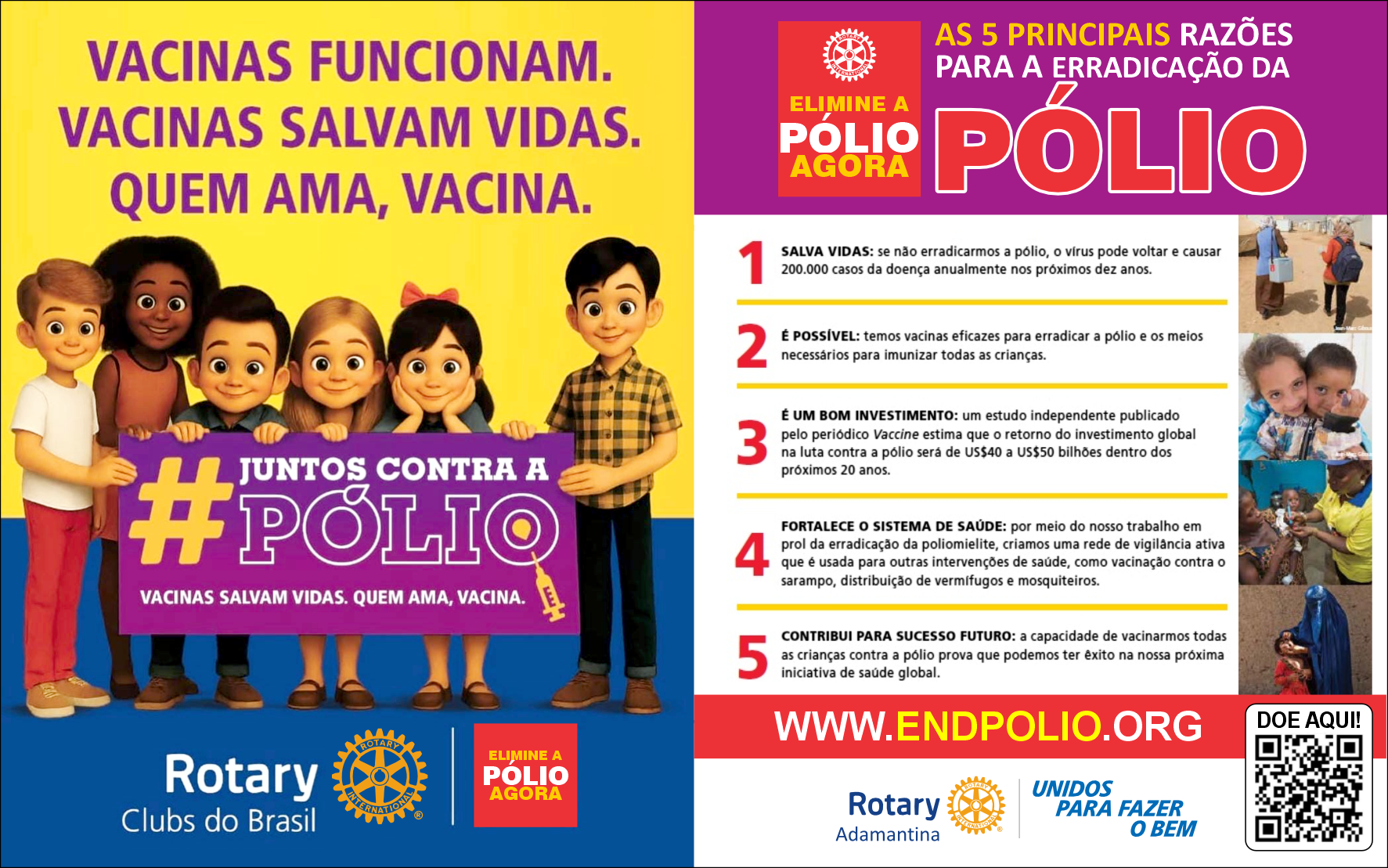 Você que ajuda nas ações do Rotary Adamantina, participando de suas promoções e ações, indiretamente está colaborando com as ações de combate à poliomielite em todo o mundo. A Ação do Rotary Adamantina se une à ação rotariana em todos os países onde o Rotary está presente.