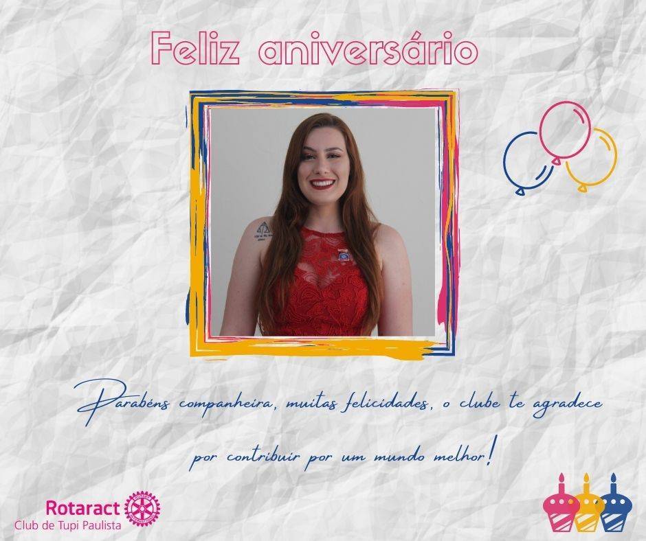 Hoje é dia da companheira e associada ao Rotaract Club de Tupi Paulista Lais Carol. Nesta data o clube deseja um feliz aniversário cheio de coisas boas, felicidades e realizações e aproveita a oportunidade para lhe agradecer por contribuir por um mundo melhor. Feliz aniversário!