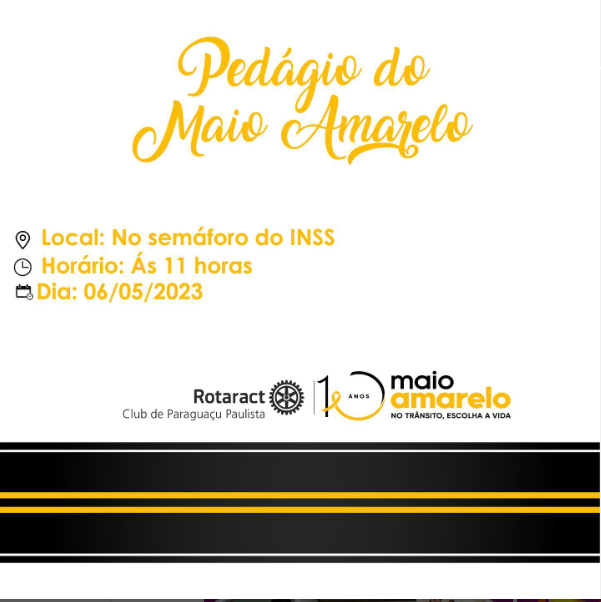No dia 06 de maio, o Rotaract clube de Paraguaçu Paulista estará fazendo uma campanha de conscientização do maio amarelo na Av Paraguaçu, na esquina com o INSS. Contamos com a presença de todos.