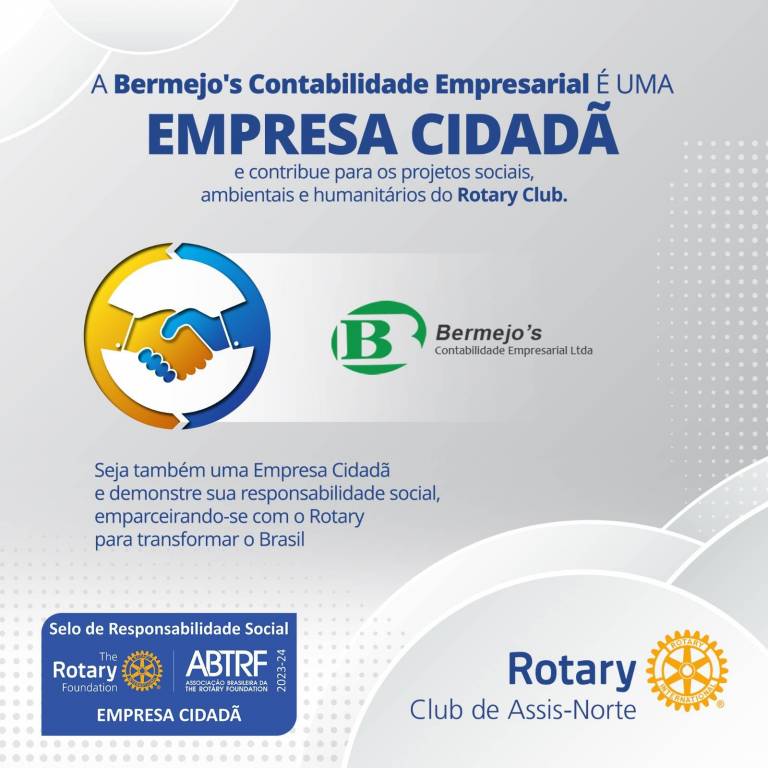 O Rotary Club de Assis-Norte conta com a parceria em seus projetos humanitários junto a Fundação Rotaria, a empresa BERMEJO´S CONTABILIDADE EMPRESARIAL LTDA que há quase 06 anos vem investindo nos Projetos realizados pelo Clube, na comunidade e no mundo.