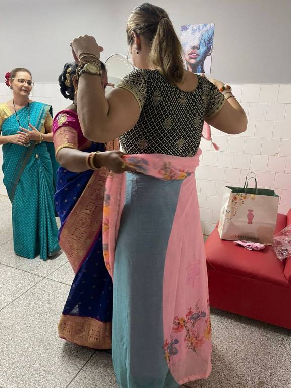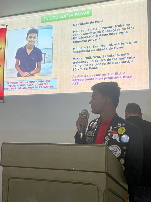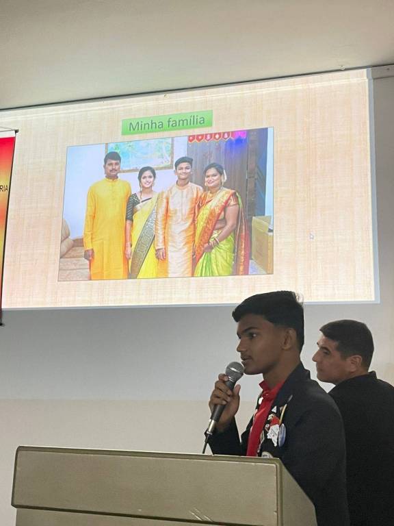 Mohini, fala seu idioma nativo, lembro que a Índia possui 23 idiomas oficiais e mais de 1.600 dialetos. A Companheira proporcionou as famílias anfitriãs a troca de cultura com as vestimentas de seus país.