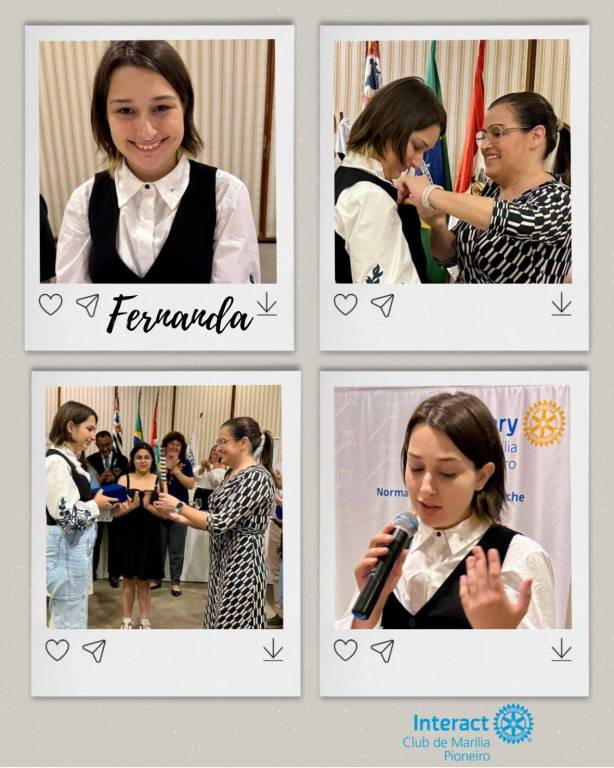 ⚙Fernanda Almeida, primeira presidente do Interact, compartilhou sua visão sobre o futuro: “O Interact é a base de um futuro brilhante e de transformação social. Com o apoio dos rotarianos e o entusiasmo desses jovens, estamos preparados para enfrentar desafios e transformar a realidade à nossa volta.”