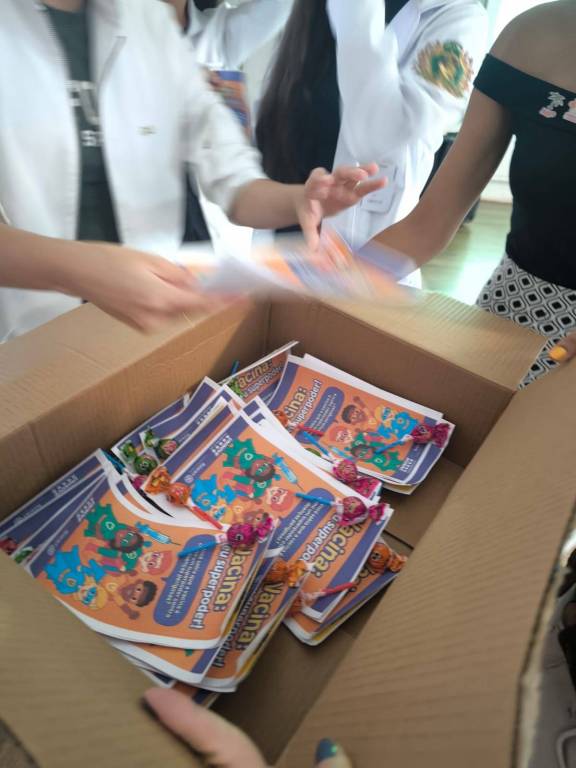 Ao final da ação, foram entregues panfletos informativos contendo idade, doses necessárias e intervalo de tempo entre as vacinas, além de um chamado para que os alunos conversem com os pais, verifiquem a carteirinha de vacinação e dirijam-se a UBS mais próxima, caso necessário.