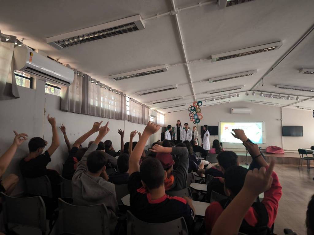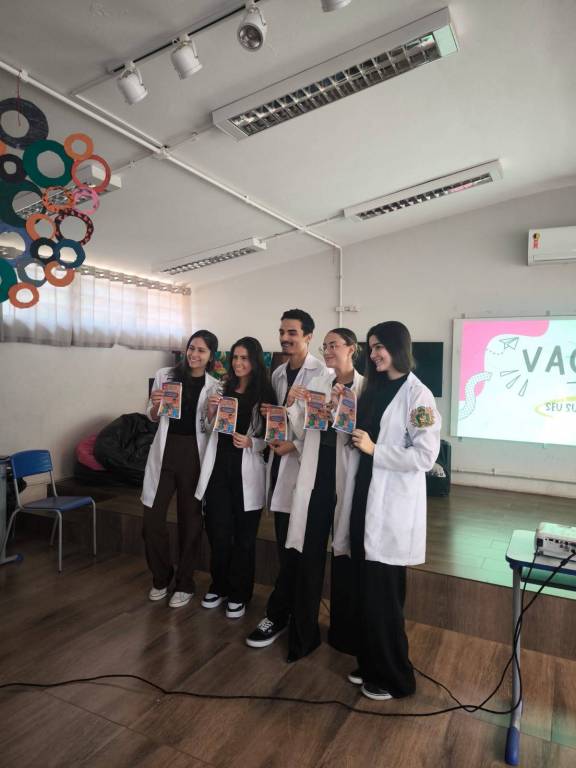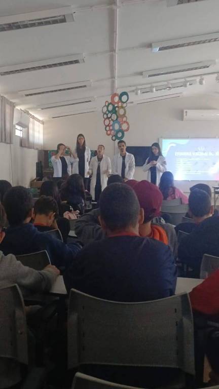 Para isso, os alunos da turma TVIII, da qual a convidada Larissa Alcântara faz parte, apresentaram uma palestra interativa, informando sobre 4 doenças, suas respectivas vacinas, sintomas e esquema vacinal, sendo elas: dengue, HPV, poliomielite e tétano.