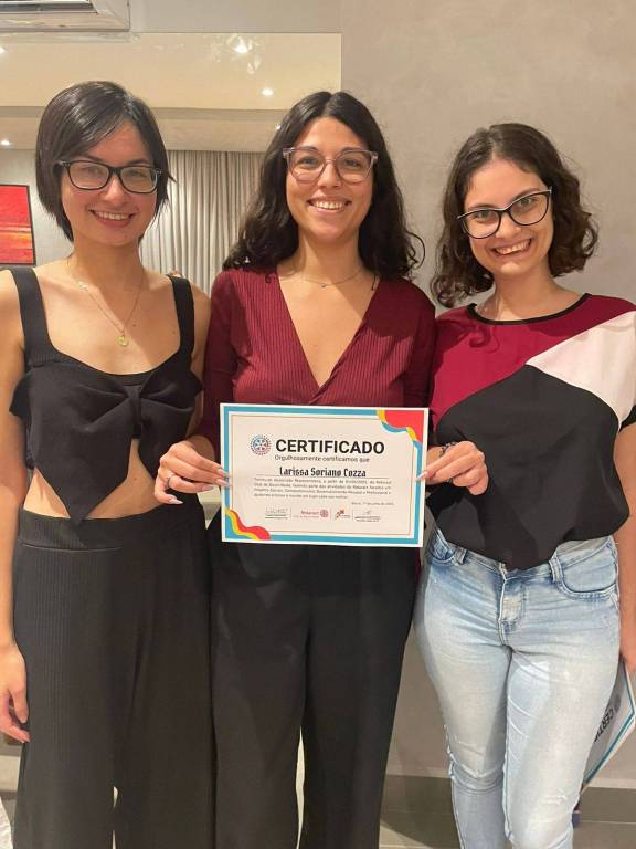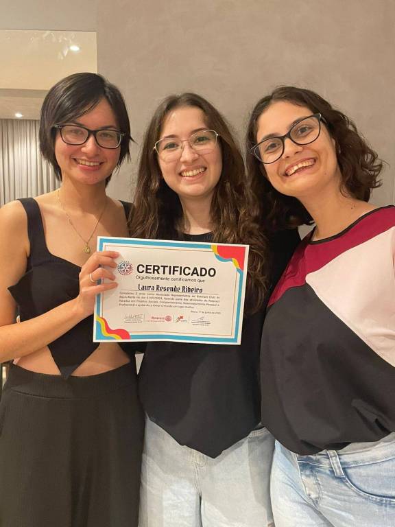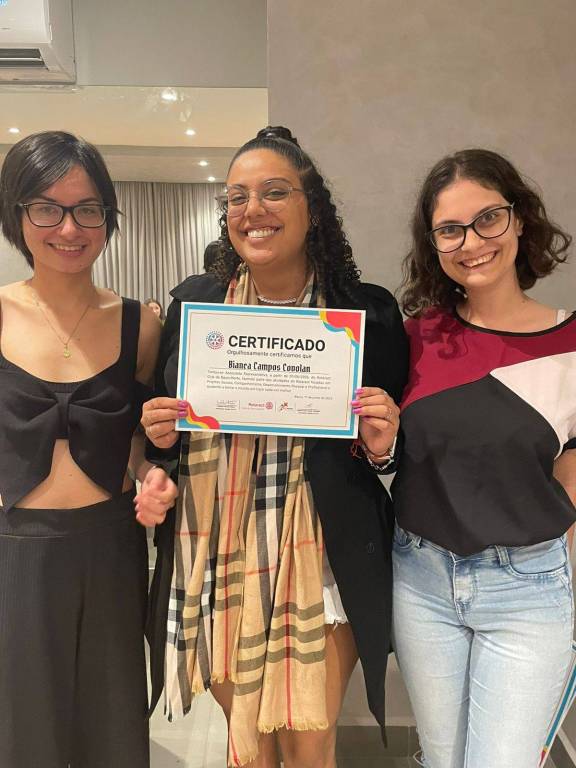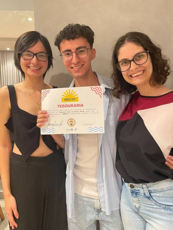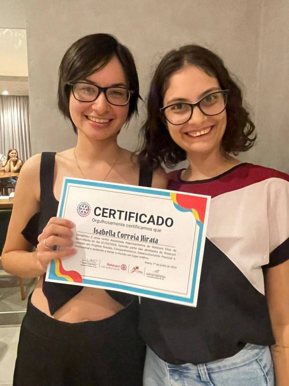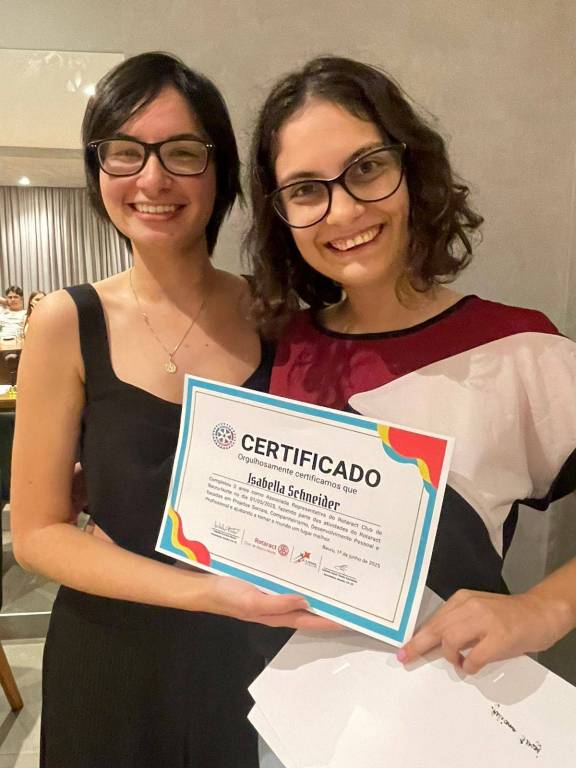 Na sequência, durante a solenidade, foram entregues os certificados de reconhecimento por tempo de contribuição aos associados Artur Penalva, Eduardo Camargo, Isabella Hirata, Isabella Schneider, Laura Resende e Luysah da Rocha, em reconhecimento à dedicação e participação ativa no clube, bem como foi realizada uma homenagem especial aos companheiros Mateus Grolla e Luysah da Rocha, pela participação dos mesmos no Concurso Distrital de Oratória.