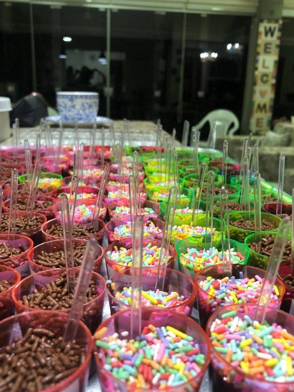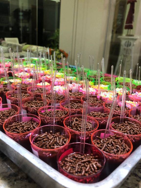 Foram preparados aproximadamente 200 doces em copinhos coloridos, distribuídos entre os sabores brigadeiro, Nesquik e leite Ninho.